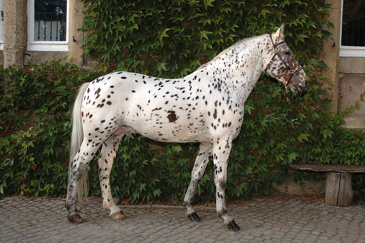 Der „Leopard“ oder „Volltiger“ weist am ganzen Körper dunkle Punkte auf weißen Fell aus. Dabei ist die Genetik tatsächlich umgekehrt: Über dem dunklen Pferd liegt ein weißer „Mantel“ mit mehr oder weniger Löchern, deren Zahl und Größe sehr variieren können. Nehmen wir an, die Grundfarbe eines solchen Pferdes wäre braun, viermal schwarz gestiefelt. Dann wären über den ganzen Körper braune Flecken verteilt, während die Flecken an den Beinen schwarz wären und auch schwarze Streifen in Mähne und Schweif vorhanden sein könnten. - Der Weißgeborene